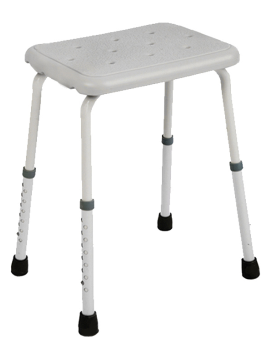 Shower chair with arms designed for comfort and safety while showering, and available with or without arms. Constructed from epoxy coated mild steel and durable plastic. They are pop-button height adjustable and lightweight and easy to manoeuvre. Suitable for use on uneven surfaces due to the non-slip rubber tips/ferrules and double holes on one of the four legs.